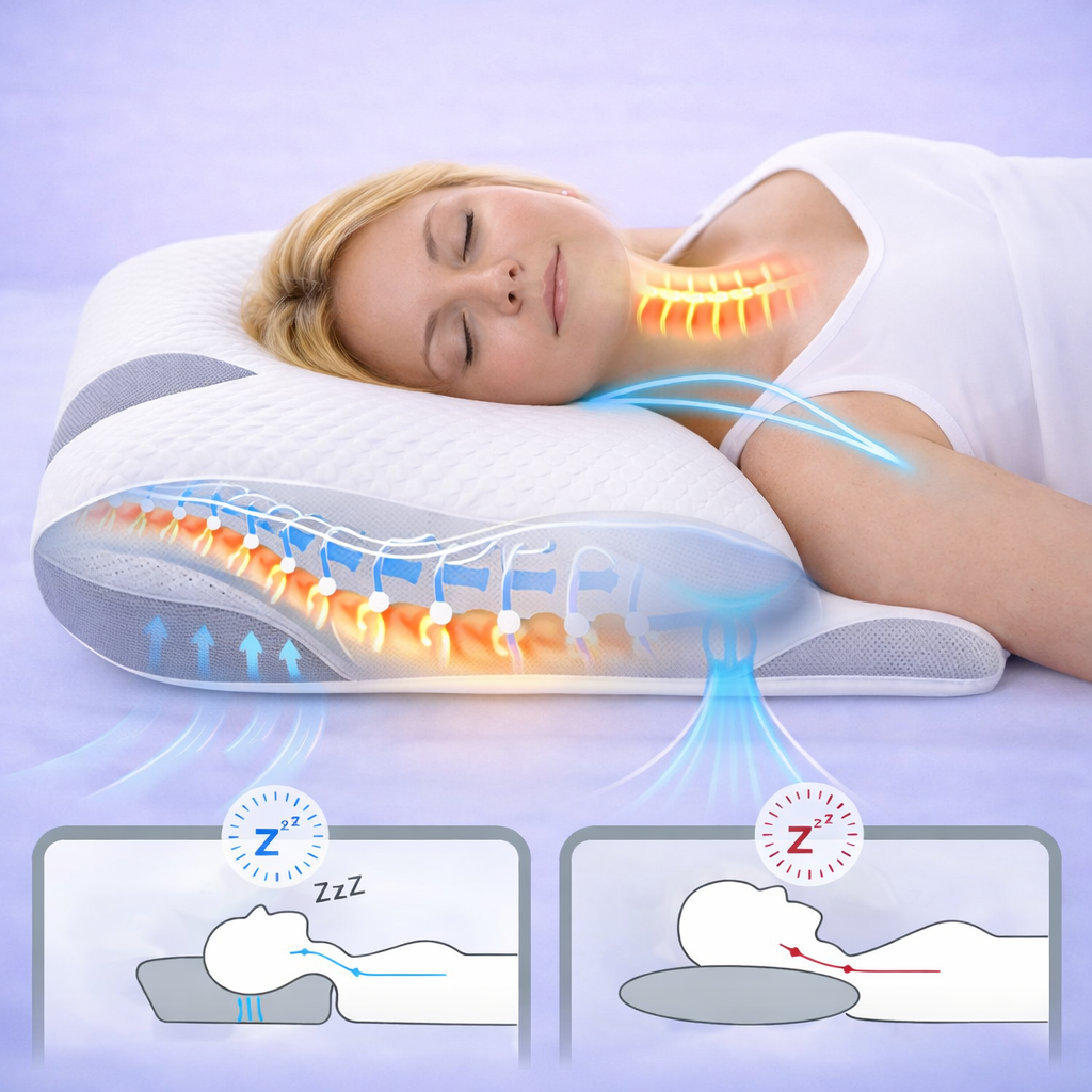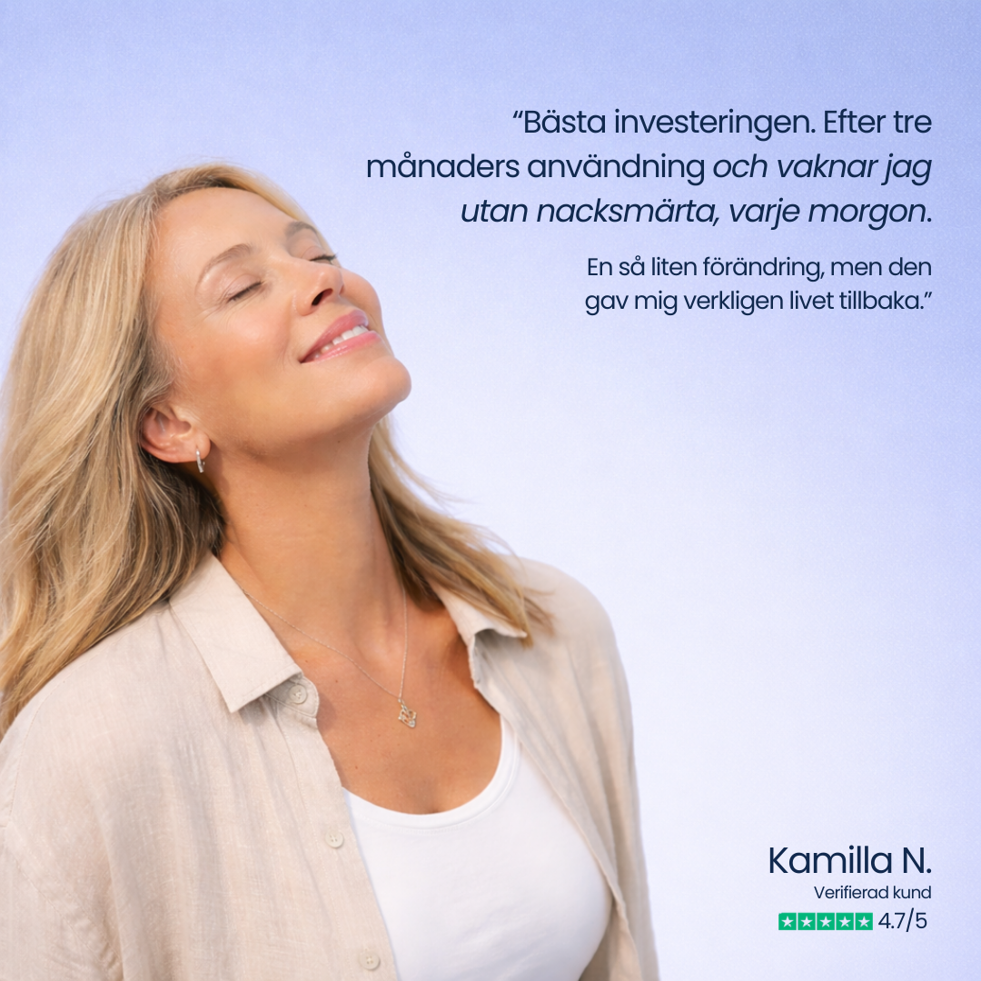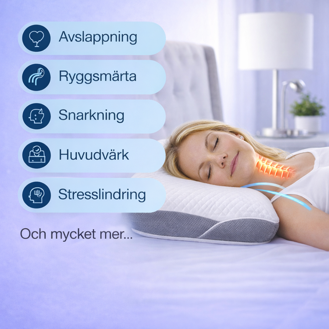 Kudden är designad för att avlasta nacke och axlar genom att hålla kroppen i en naturlig position, vilket många upplever minskar stelhet och obehag.